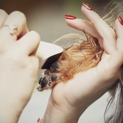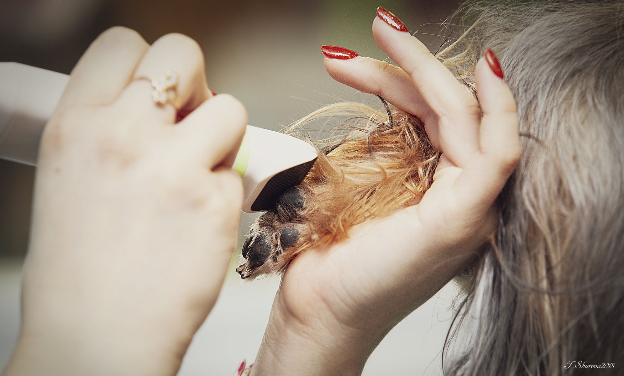 4. Nałożenie sprayu antystatycznego, wyczesywanie martwego podszerstka przy jednoczesnym suszeniu każdego pasma sierści pupila.